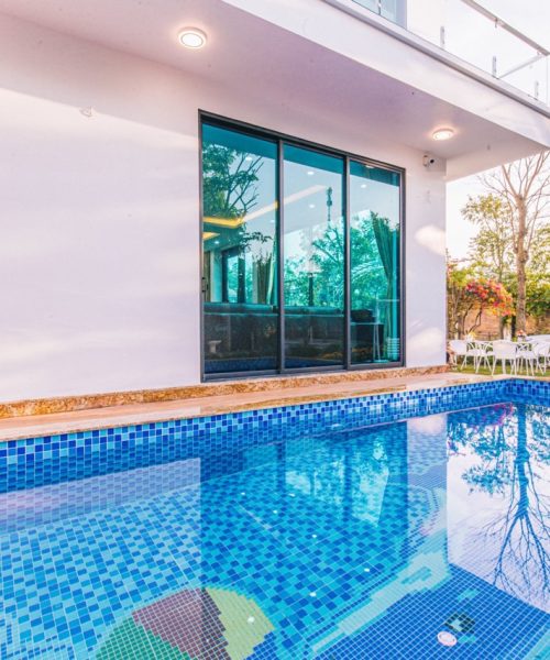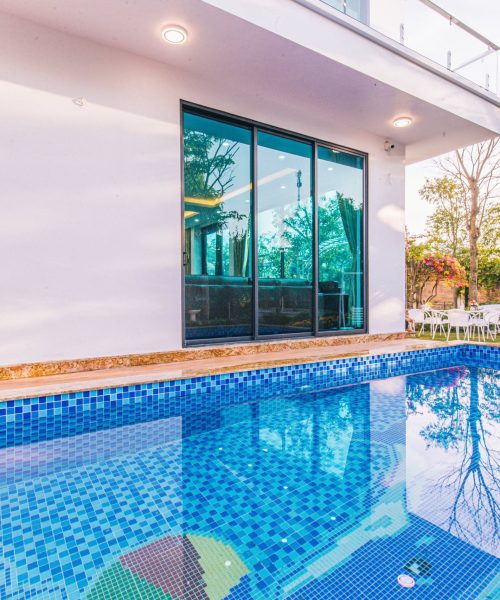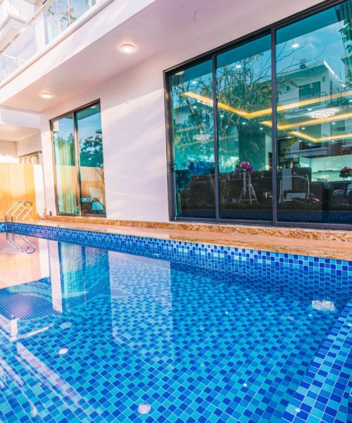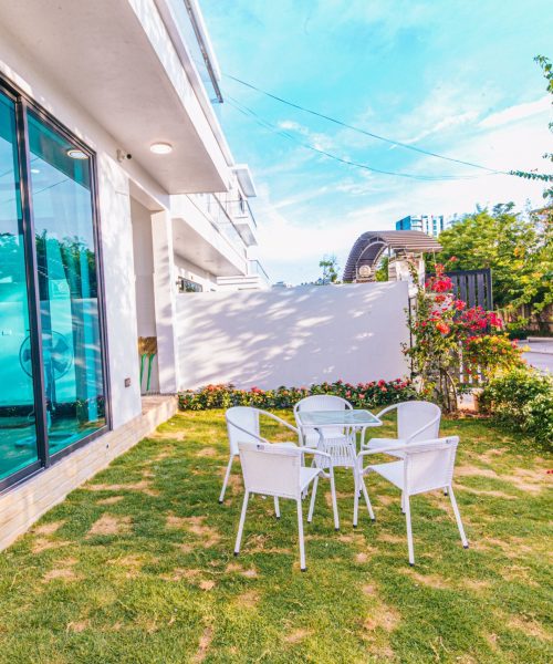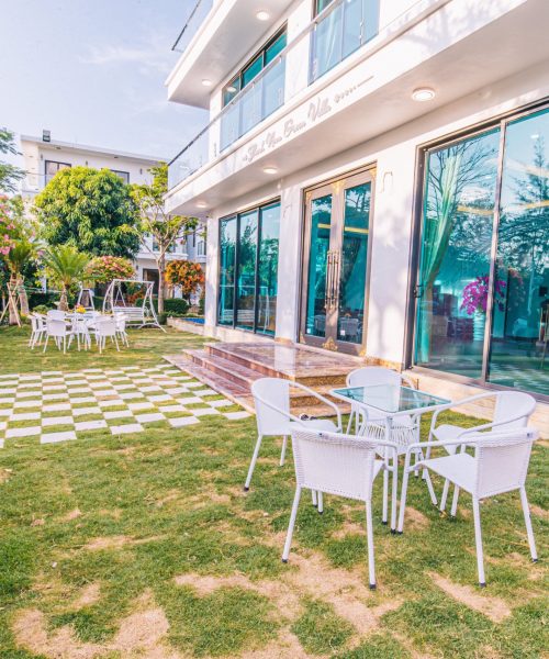 - Sân rộng 150m2 tổ chức BBQ, pool party, đủ tổ chức 20 bàn
