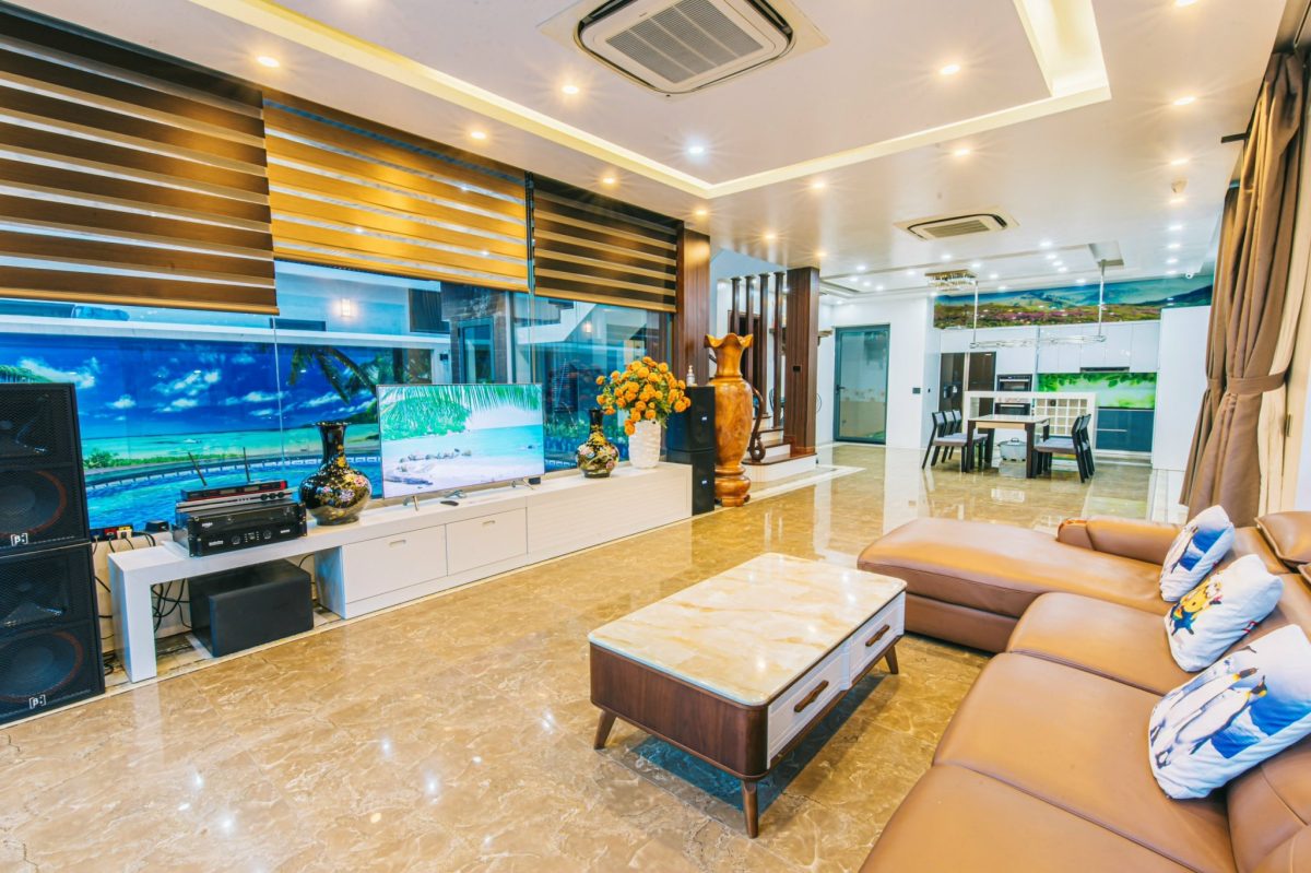 - 1 phòng khách rộng : Tivi 65in, truyền hình internet TV, Điều hòa, Quạt cây, Wifi, Bàn ghế tiếp khách uống trà, Karaoke, WC)