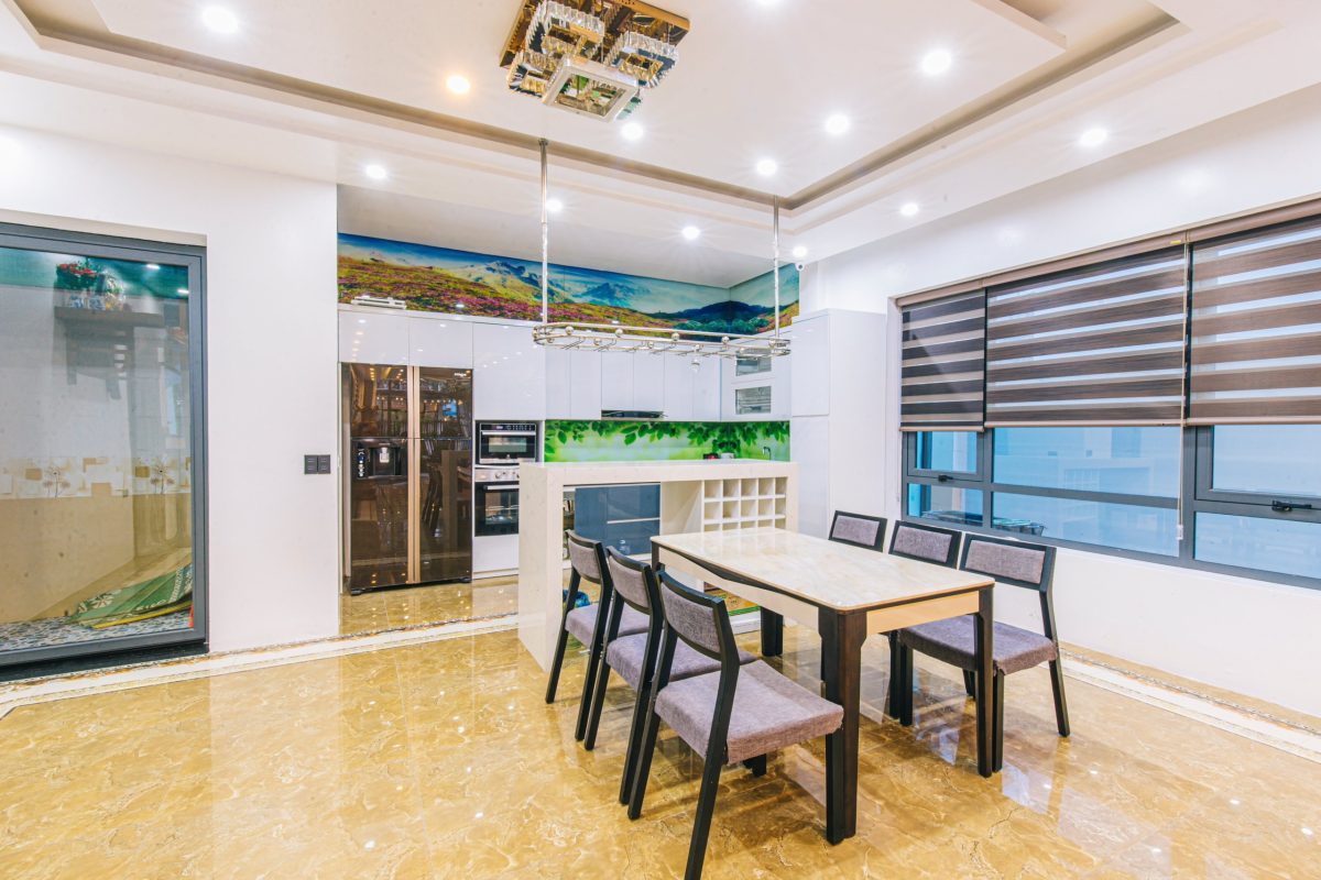 - 1 phòng bếp: Có đầy đủ Tủ lạnh, Bếp từ + Bếp gas Công nghiệp ,lò vi sóng, lò nướng, nồi, chảo, bát đũa, nồi nấu lẩu.